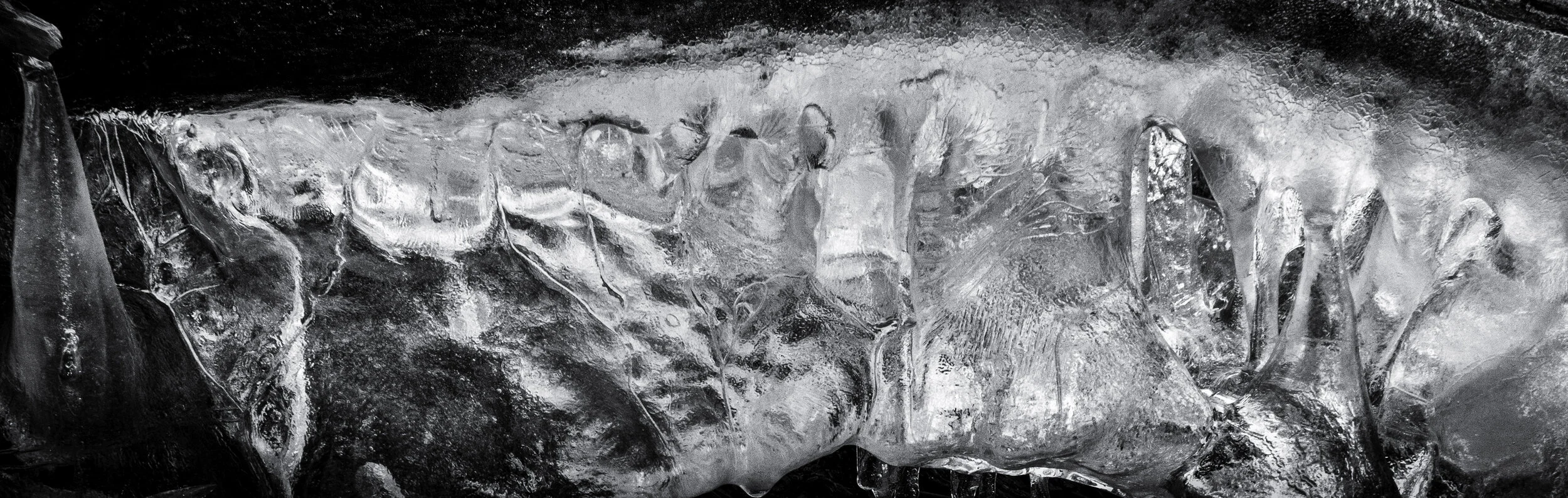 Abhaya Mudra, where the right hand is raised in a position resembling oath taking; fingers straight and palm facing outward, is a gesture familiar to diverse cultures and one imbedded in the psyche of humanity long before its depictions as a favored gesture of Buddha or Christ. It has been applied like a gear shift to align an individual harmoniously with cosmic forces and project an energy of protection, peace and a sense of strong, deep inner security. When shared with others, it is an offering of encouragement to develop fearlessness not only through yogic and meditative disciplines but through more unlimited realization of all dimensions of the self. It reminds us that in overcoming fear, we have a greater capacity to harmonize and excel through even the most challenging threats. That Abhaya manifested momentarily in a figure seated in lotus pose between layers of rushing water and sheer ice at a time when the Covid-19 pandemic was just beginning in China is something which continues to inspire Goudreault’s search for greater understanding of the Energy and Intelligence networked and operating throughout all of Nature and the self.